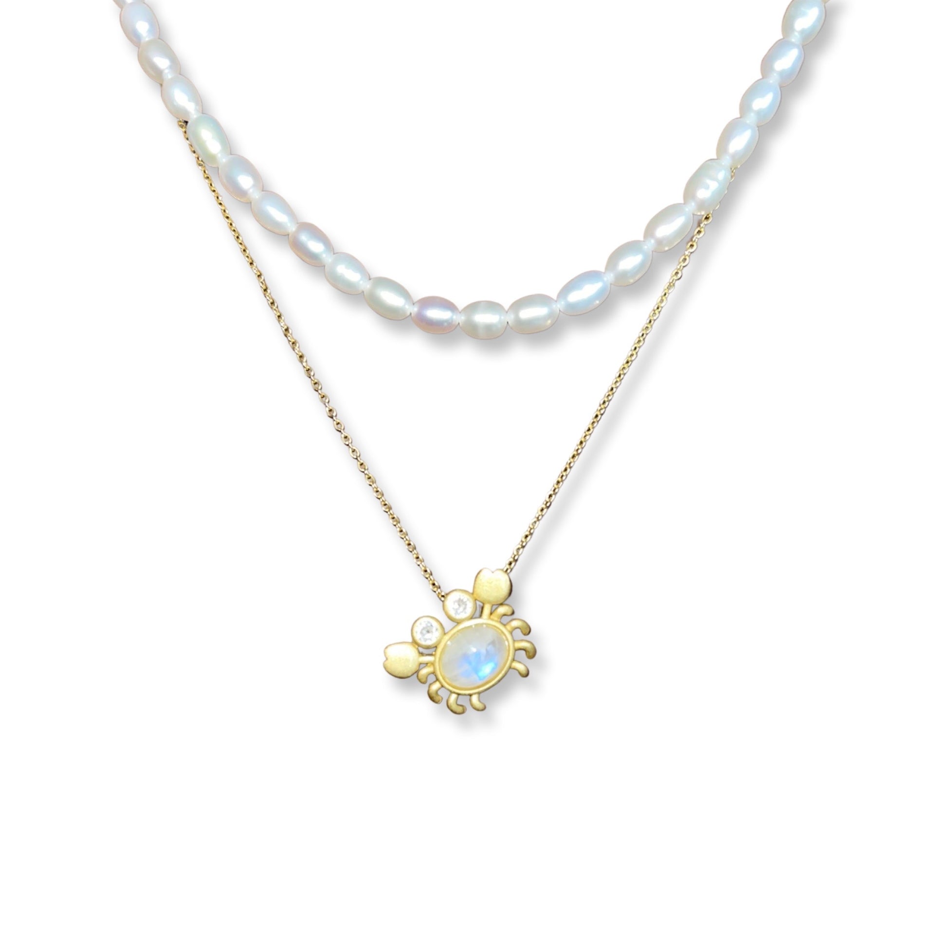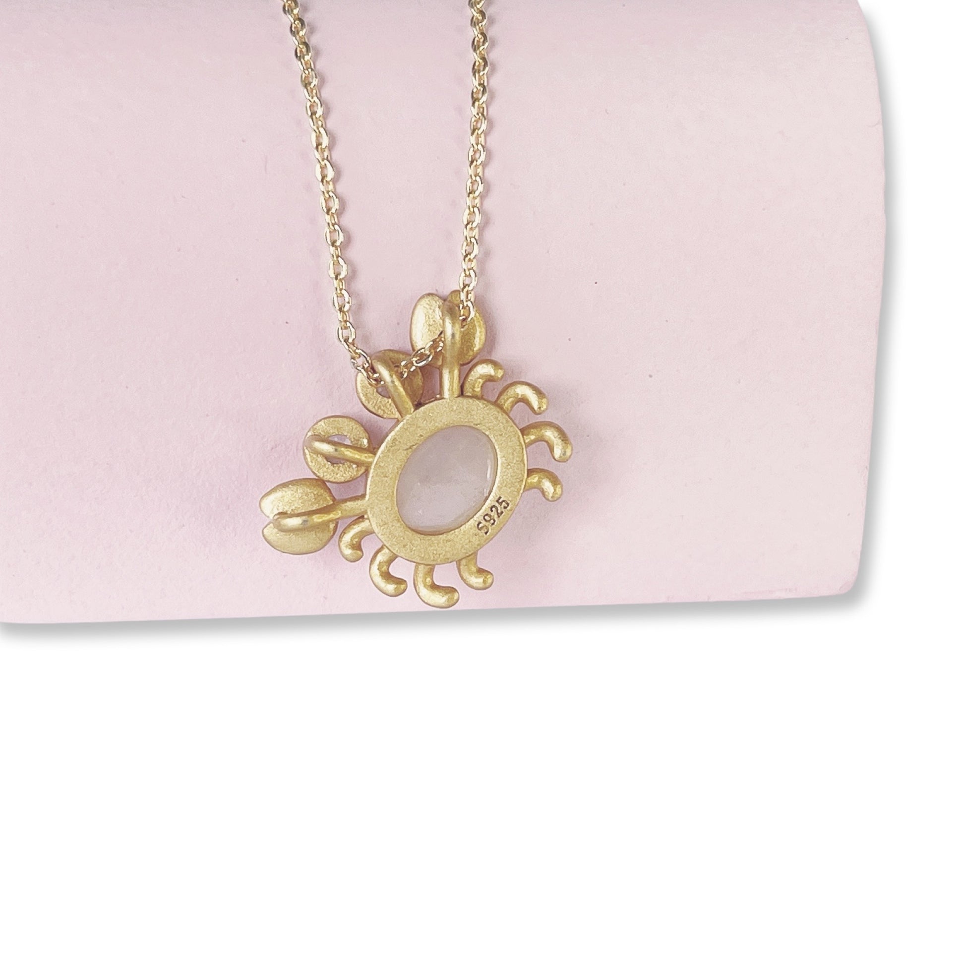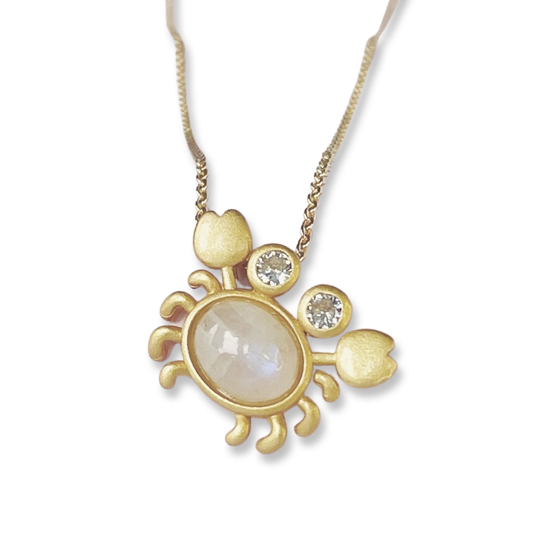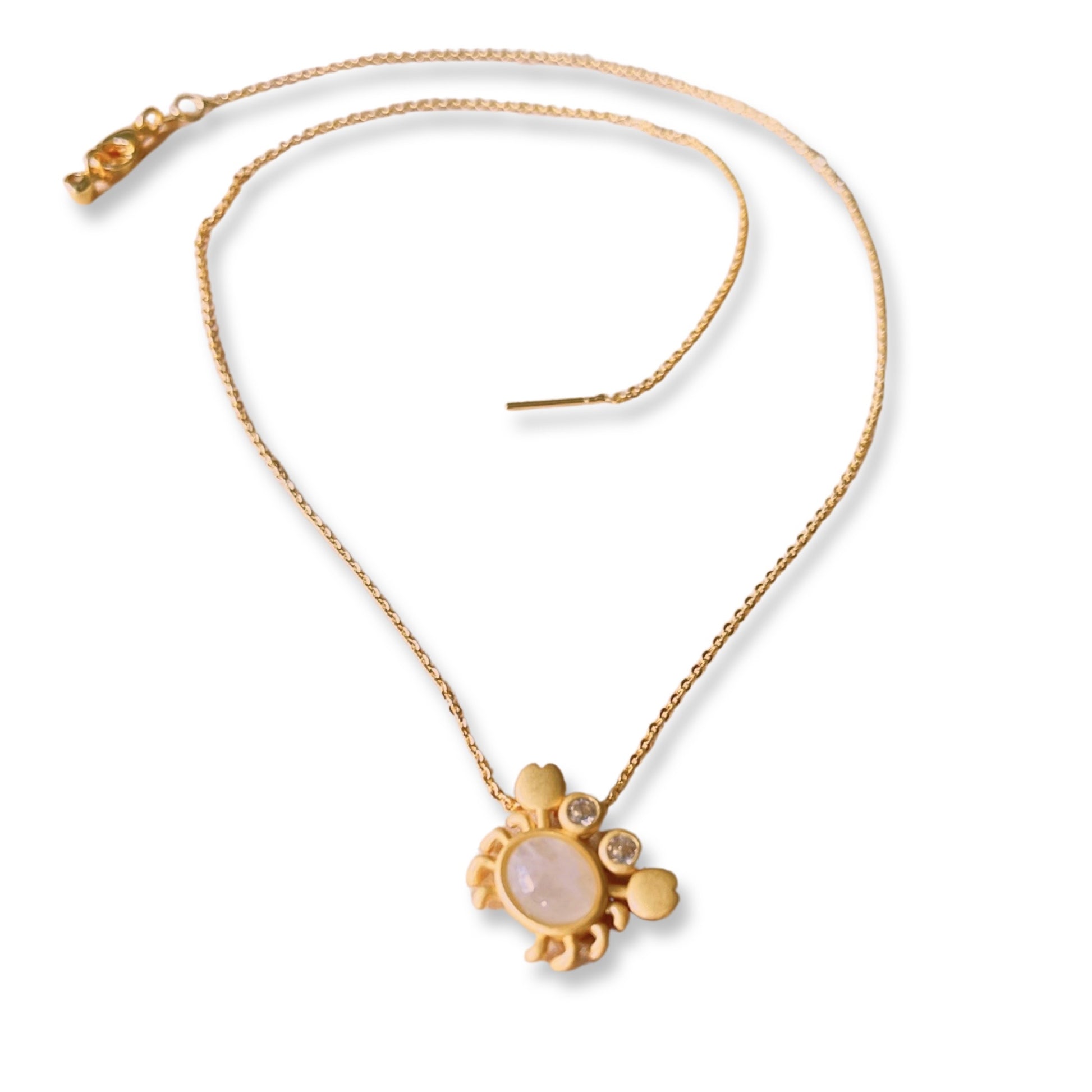 Feeling the pinch from this super cute crab necklace. The pendant is made of natural rainbow moonstone and gold plated sterling silver, the adjustable chain is made of gold plated metal.