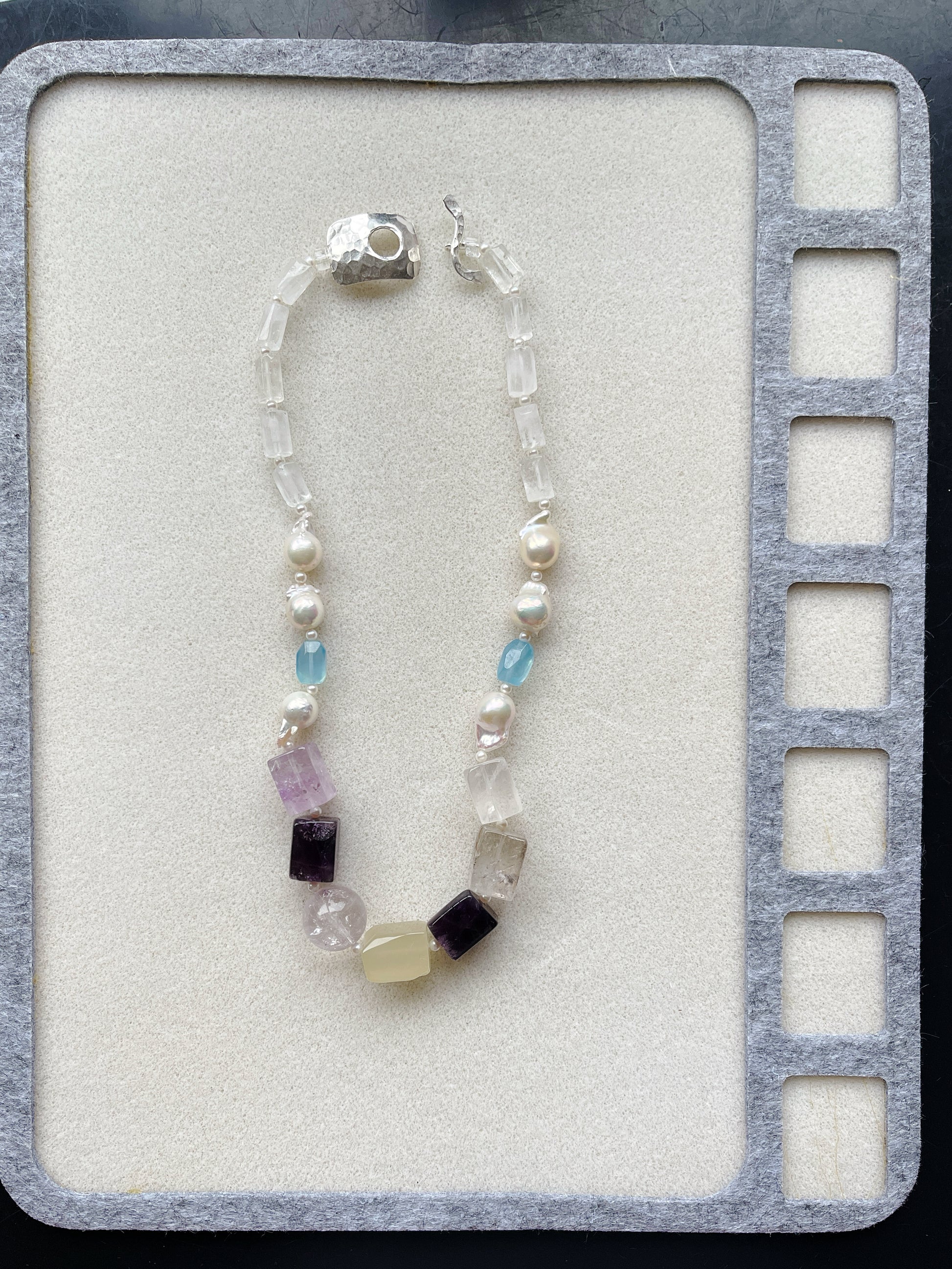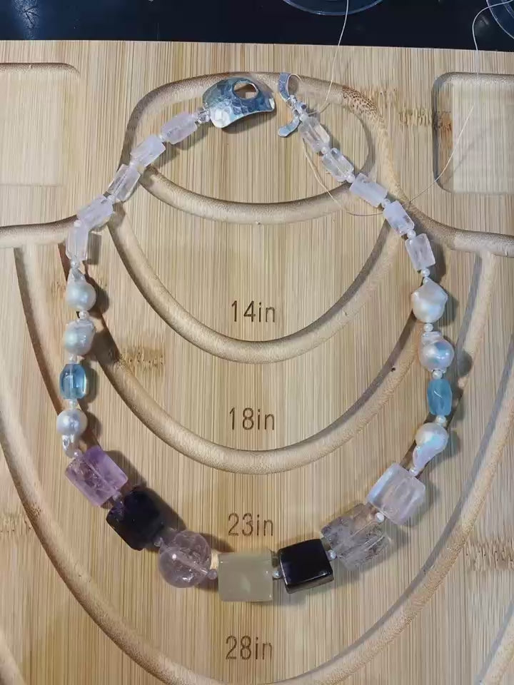 Materials: chunky natural mixed gemstones (Amythests, Clear Quartz, Citrine, Aquamarines) + Baroque pearls + 3.5mm freshwater pearls